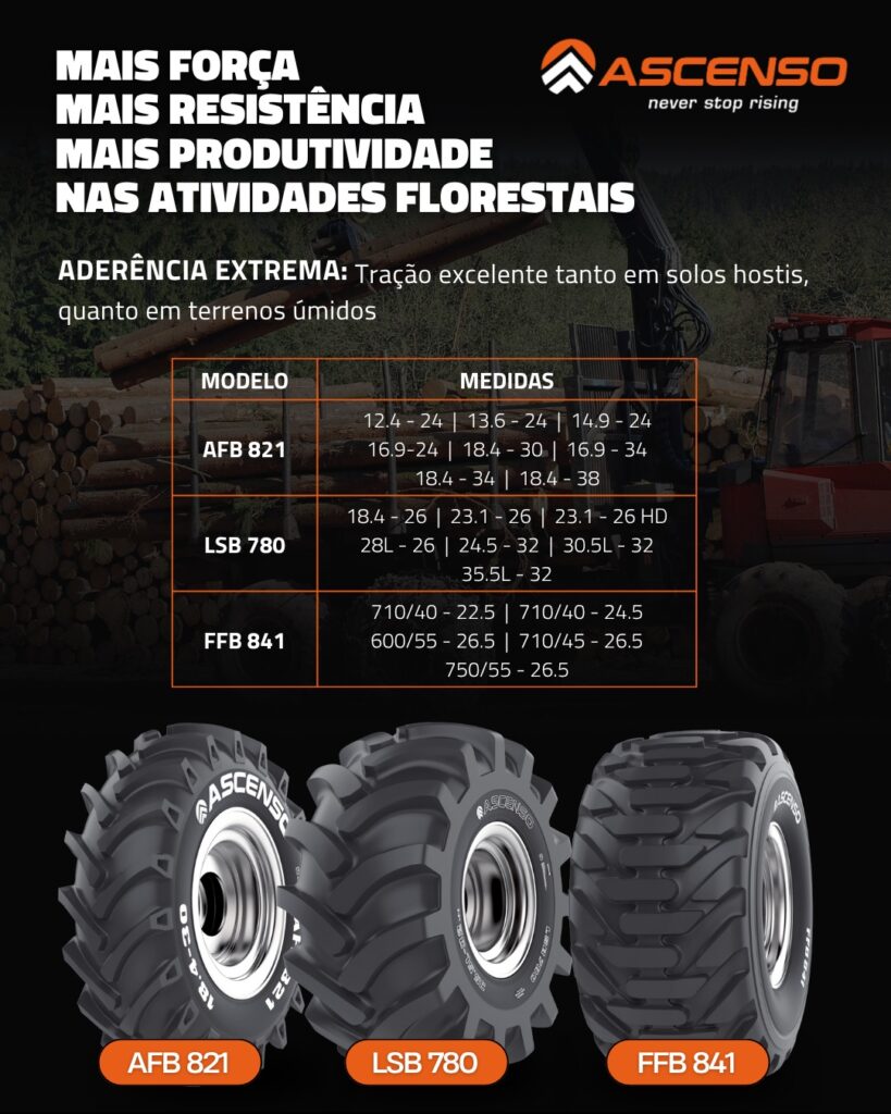 Especialista em desenvolver pneus robustos e resistentes para operações severas, a Ascenso conta com uma linha agrícola completa, que vai desde pneus para tratores de pequeno porte e implementos leves até modelos de alta performance para tratores articulados de grande potência, colheitadeiras, pulverizadores autopropelidos, skidders e forwarders. Essa expertise garante que cada pneu florestal produzido pela marca tenha o desempenho, a durabilidade e a confiabilidade necessárias para enfrentar as condições mais empenhativas no campo e na floresta.