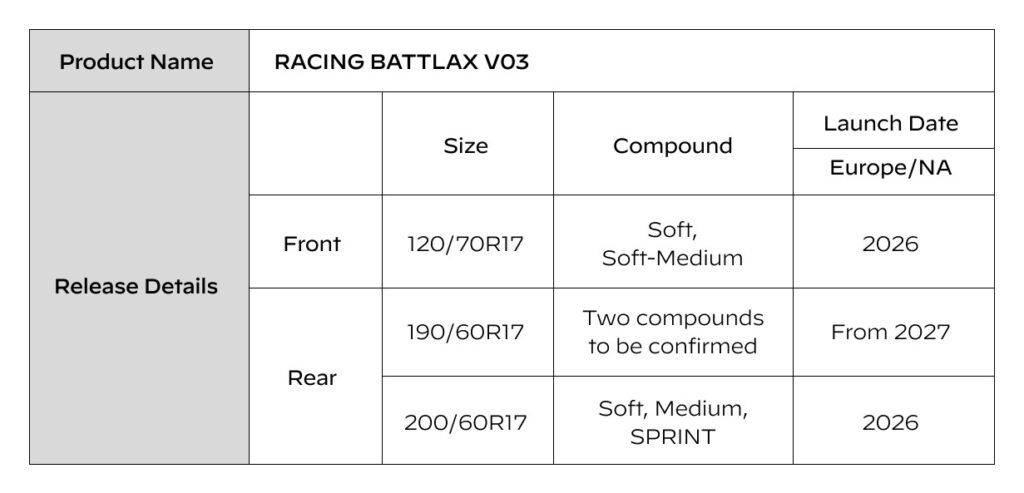A principal novidade da linha é a introdução da especificação traseira “Sprint”, desenvolvida para maximizar o pico de aderência em corridas de curta duração. Com essa configuração, o Racing Battlax V03 Sprint oferece uma melhoria de 1,9% nos tempos de volta em relação ao V02 Soft, de acordo com medições internas.